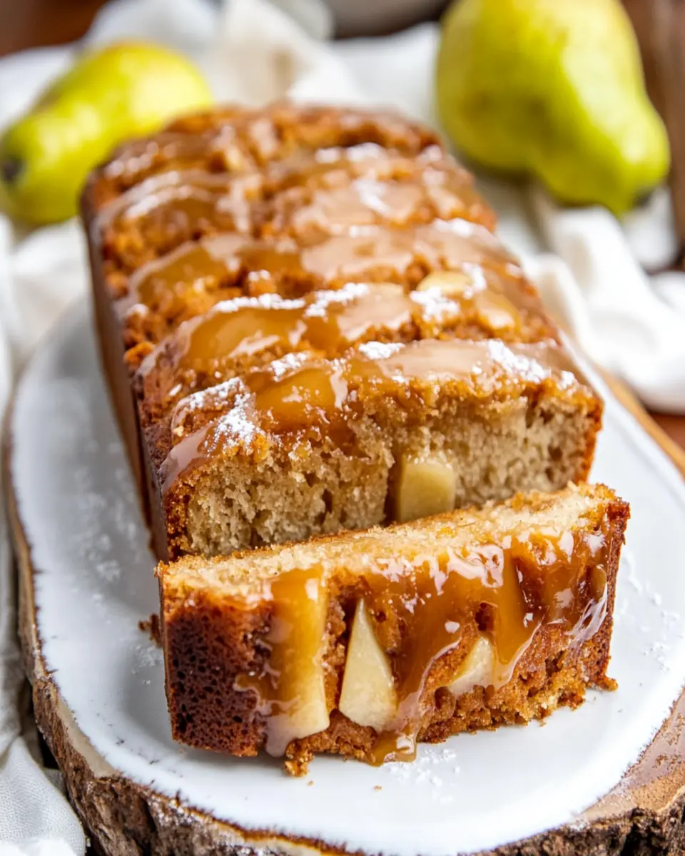Start your day with a slice of this bread alongside a steaming cup of coffee or tea. The sweetness of the caramel and the freshness of the pears complement your morning beverage perfectly, making it a great breakfast option. A light dusting of powdered sugar can add an elegant touch, too.