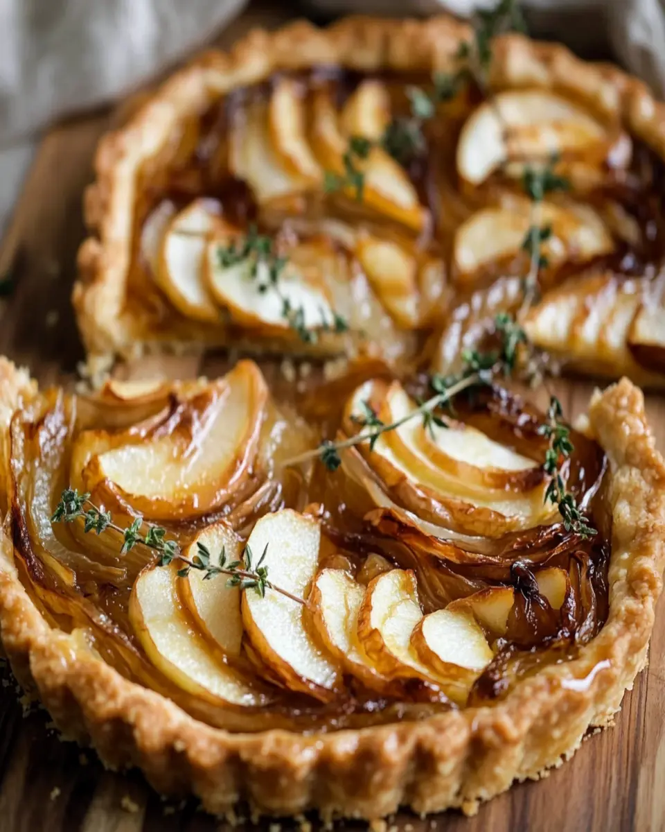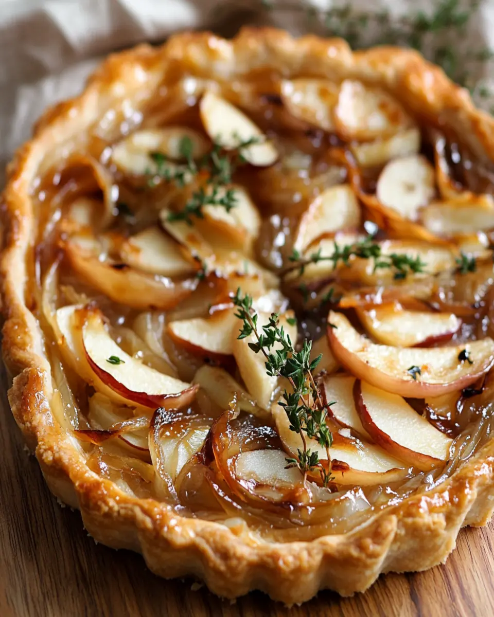 In summary, the Caramelized Onion and Apple Tart is a delightful dish that beautifully balances sweet and savory flavors, making it perfect for any occasion. This tart is not only easy to prepare but also versatile, suitable as a starter or a main dish. Its rich aroma and appealing presentation will impress your guests and elevate your meal. Whether served warm or at room temperature, this tart is sure to become a favorite in your recipe collection. Don’t hesitate to cook, save, share, or comment on your own experiences with this delicious recipe!