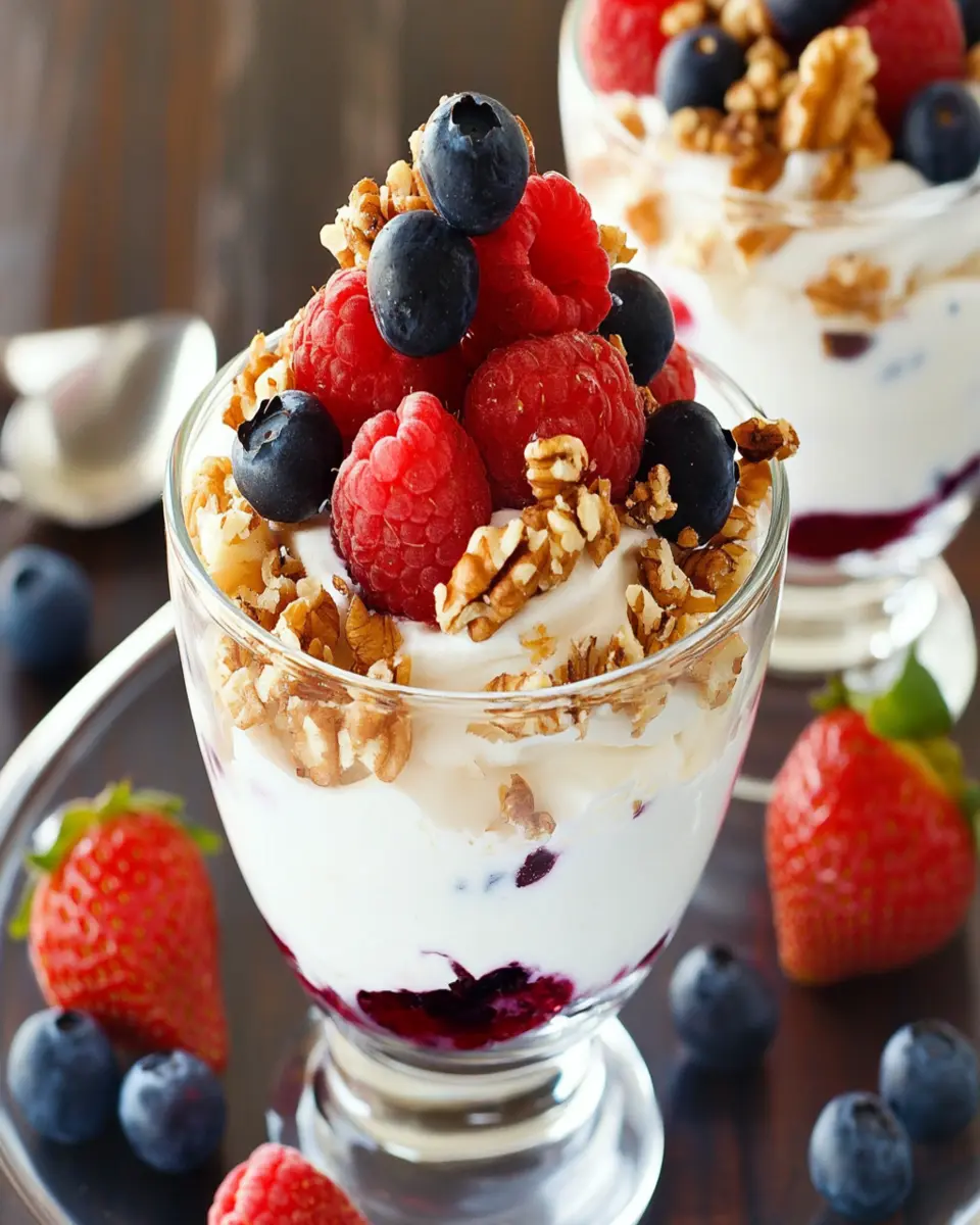 A delicious and healthy Greek yogurt parfait layered with fresh berries, crunchy nuts, and a drizzle of honey.