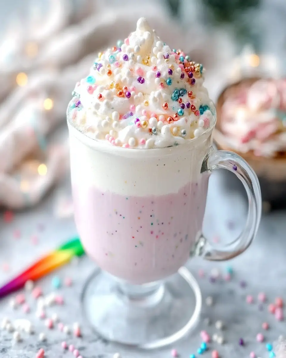 In this recipe, we combine creamy milk and heavy cream with rich cocoa powder, sweetened just right with sugar, then topped with fluffy whipped cream and colorful rainbow sprinkles. It’s a treat that captures the spirit of fun and festivity, making it a perfect choice for birthday parties or themed events. So grab your favorite mug, and let’s dive into this delightful recipe that promises warmth, joy, and a touch of magic!