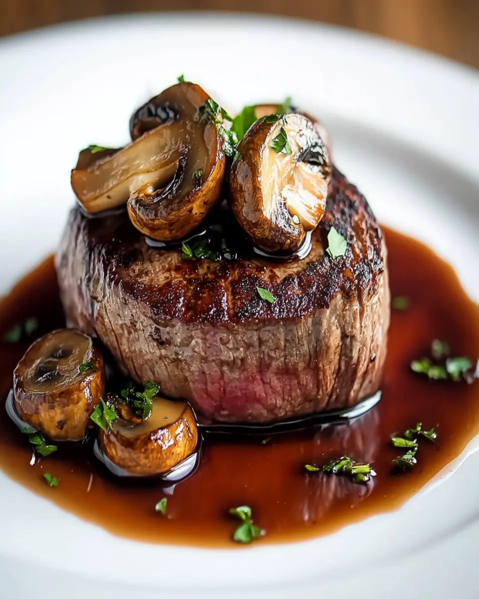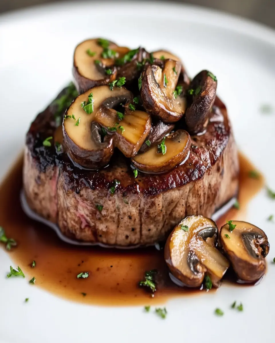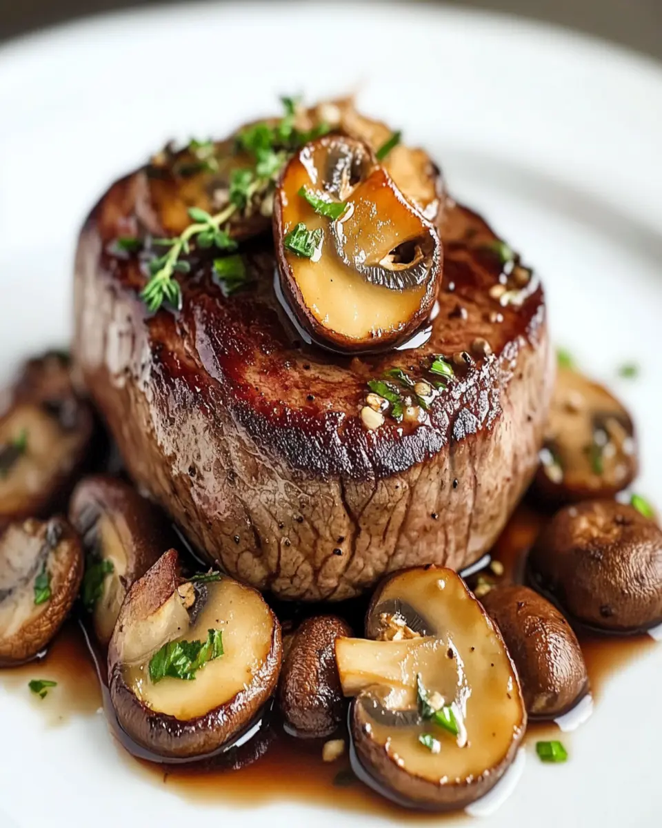 A delicious and elegant steak dish featuring perfectly pan-seared filet mignon paired with savory mushrooms.
