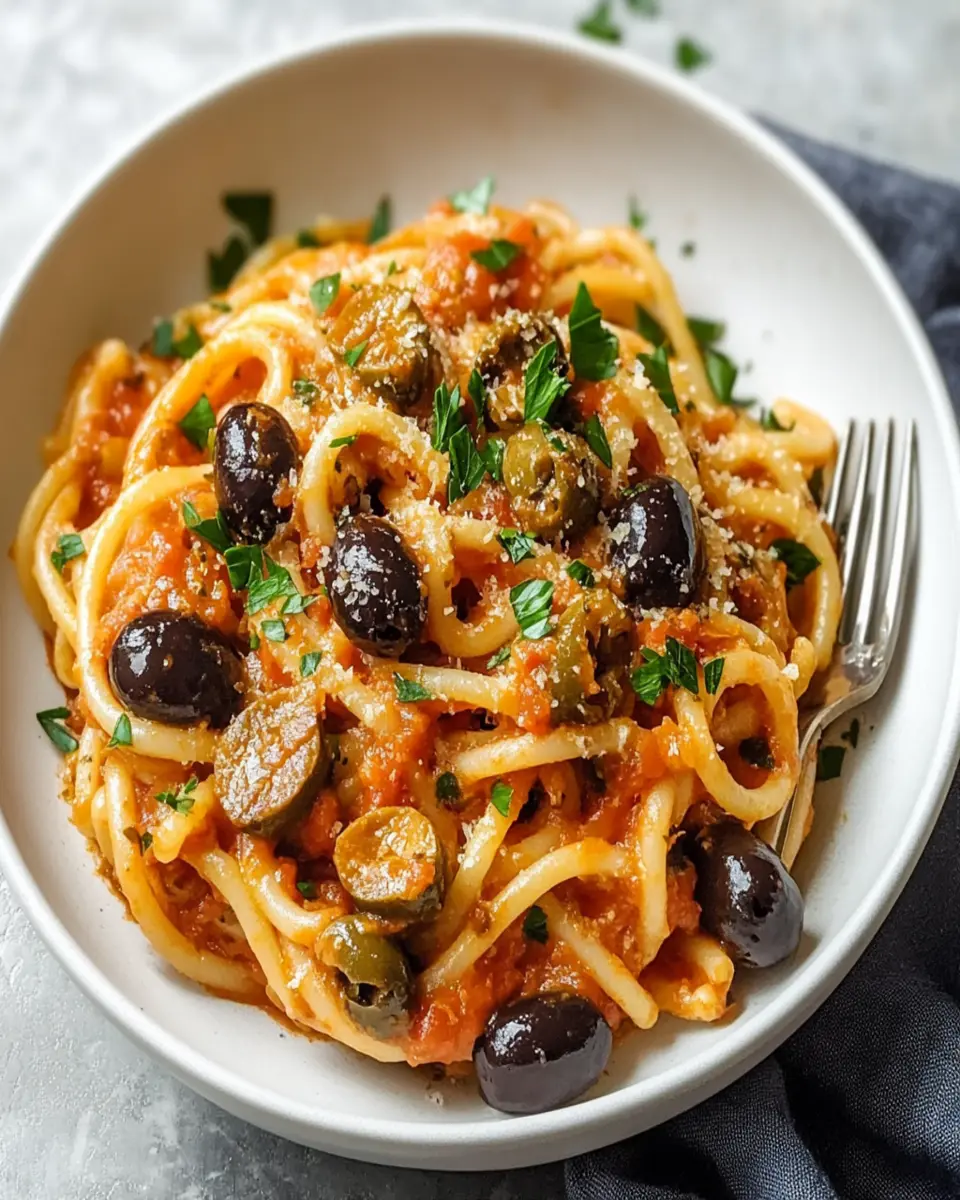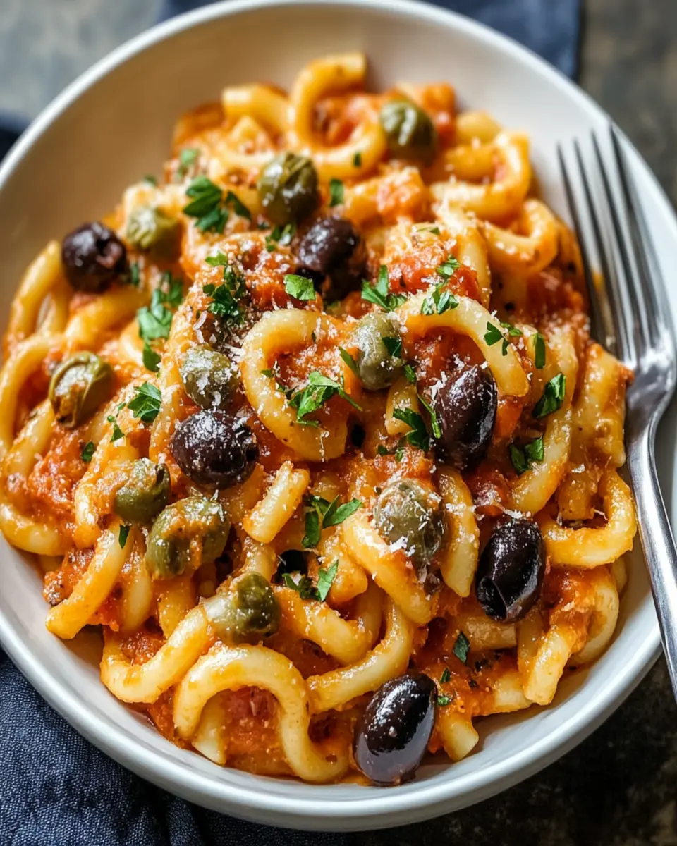 A classic Italian pasta dish with a robust sauce made from tomatoes, olives, capers, and garlic.