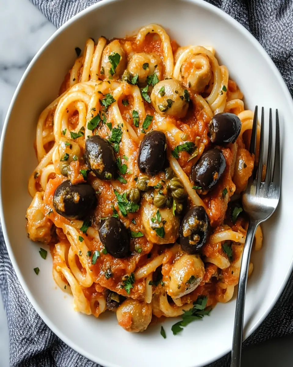 Pasta Puttanesca is a delightful and robust Italian dish that showcases the vibrant flavors of tomatoes, olives, and capers. Quick and easy to prepare, it’s perfect for busy weeknights or when you want to impress guests with minimal effort. The balance of flavors makes it a satisfying meal that can be enjoyed fresh or as leftovers. Remember, this dish is all about the quality of ingredients, so choose the best you can find for the most flavorful experience. Give Pasta Puttanesca a try, and don’t forget to share your cooking experience with friends and family!
