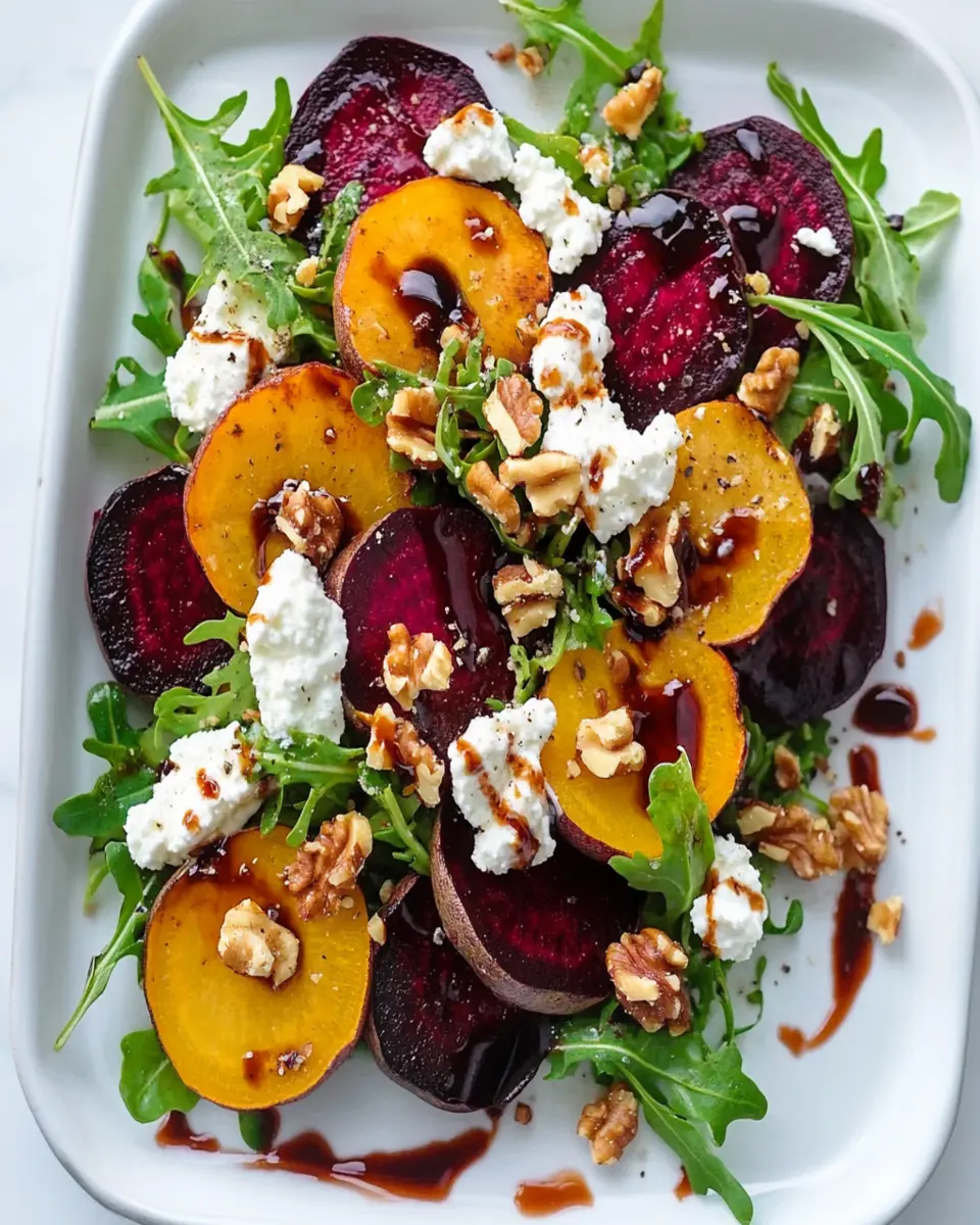 A delicious and vibrant salad featuring roasted beets, creamy goat cheese, and fresh greens.
