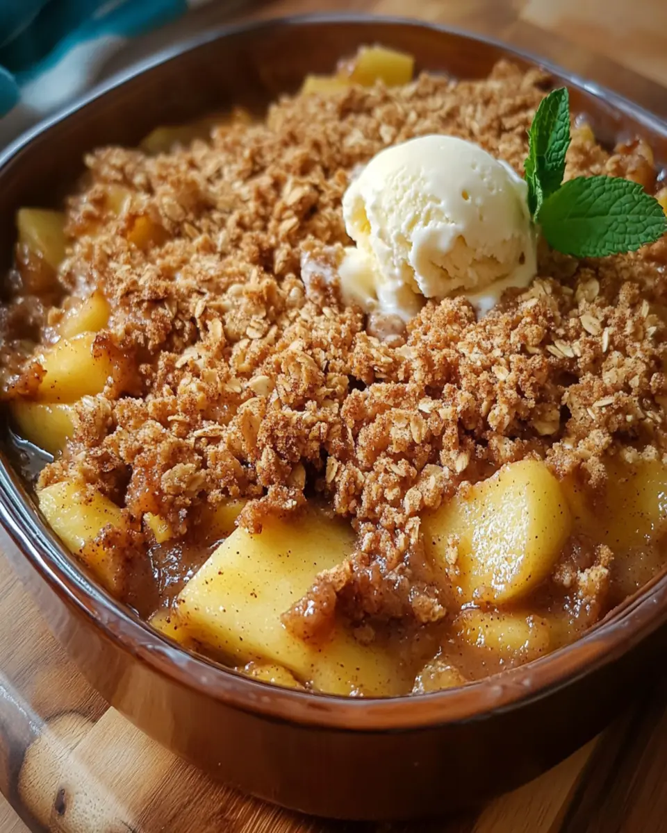 A delicious and warm dessert featuring spiced apples topped with a crumbly crisp.