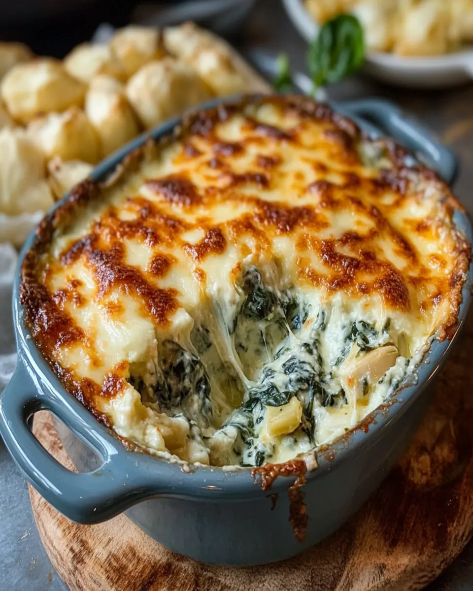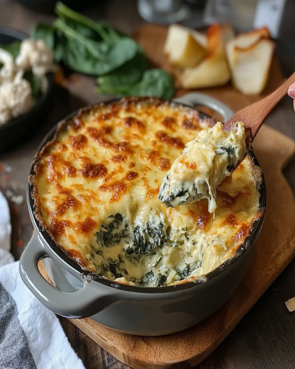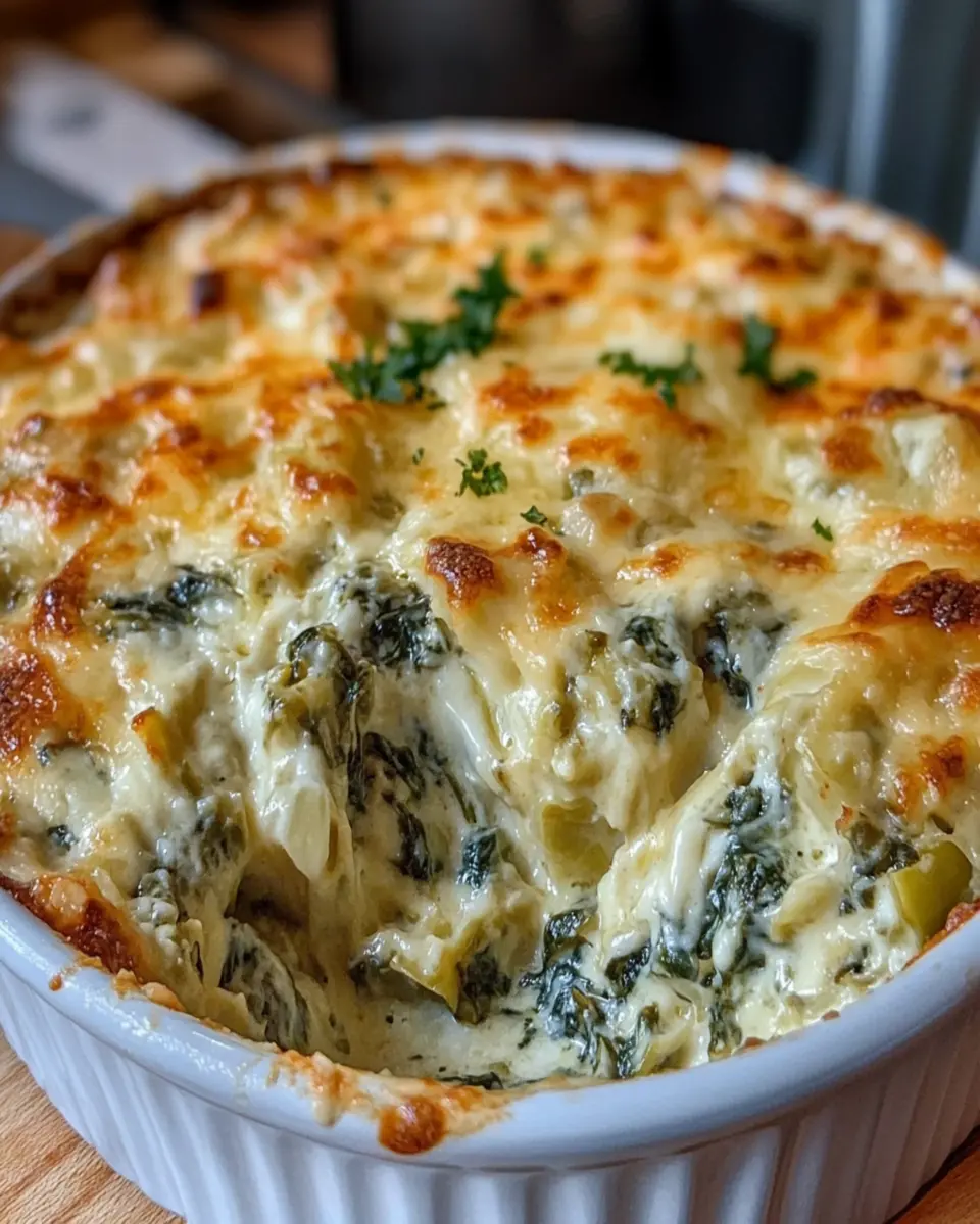 A creamy and cheesy spinach and artichoke dip casserole that’s perfect for parties or as a comforting dish at home.