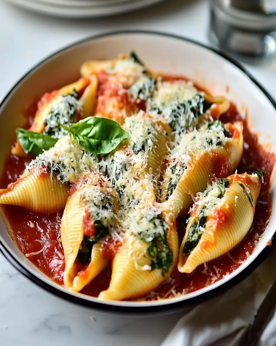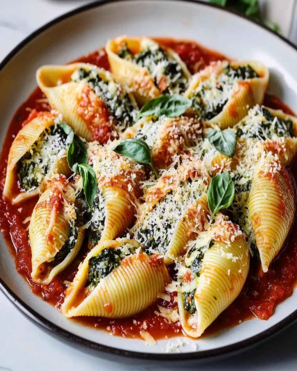 A delicious and hearty dish featuring large pasta shells filled with a creamy spinach and cheese mixture, baked to perfection.