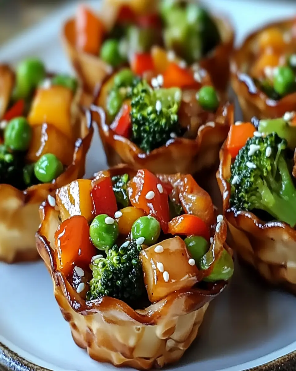 A delicious and healthy appetizer featuring flavorful stir-fried vegetables served in crispy wonton cups.